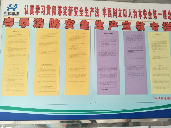 為增強廣大職工春季消防安全意識,提高自我保護的能力,將全站安全生產(chǎn)工作做到防患于未然,雞鳴驛收費站根據(jù)季節(jié)特點,開展了春季安全生產(chǎn)宣傳教育工作,制作了以春季高速路行車安全、消防安全知識、滅火器的使用、日常安全生活小貼示為內(nèi)容的安全生產(chǎn)宣傳教育專欄展示板,展板內(nèi)容簡潔凝練、易懂易記。寓教于樂的學(xué)習(xí)方式更易被大家接受,提高了廣大職工學(xué)習(xí)的興趣。通過對專欄內(nèi)容的學(xué)習(xí),重新熟悉了干粉滅火器的使用方法、使用技巧;同時,以學(xué)習(xí)筆記的形式,再次熟悉了公司各項安全生產(chǎn)制度及法律法規(guī),并要求大家要照章執(zhí)行。通過宣傳教育,明確了做好春季安全生產(chǎn)工作的重點,有利于安全生產(chǎn)工作的更好開展。(雞鳴驛收費站 王春燕)