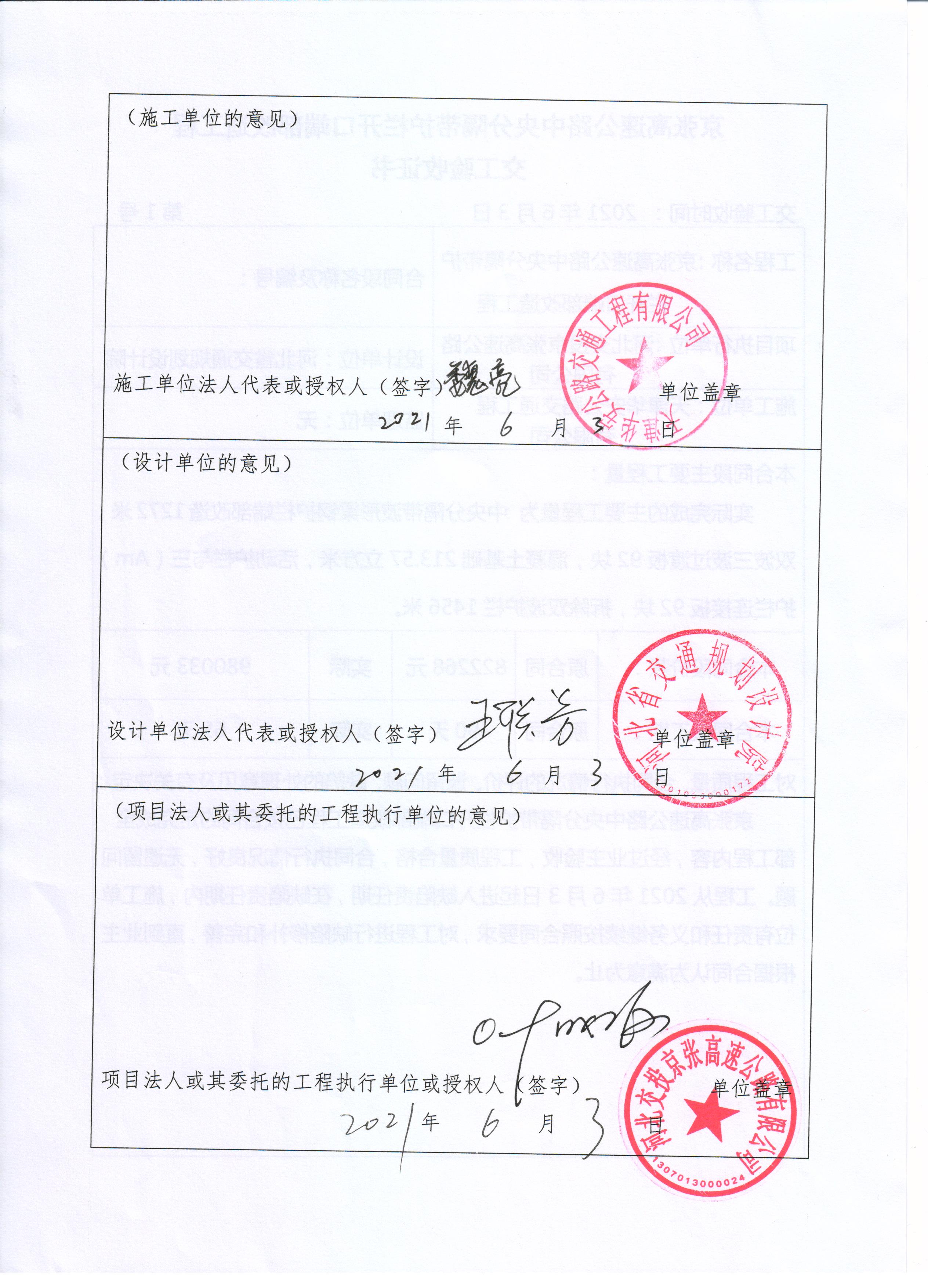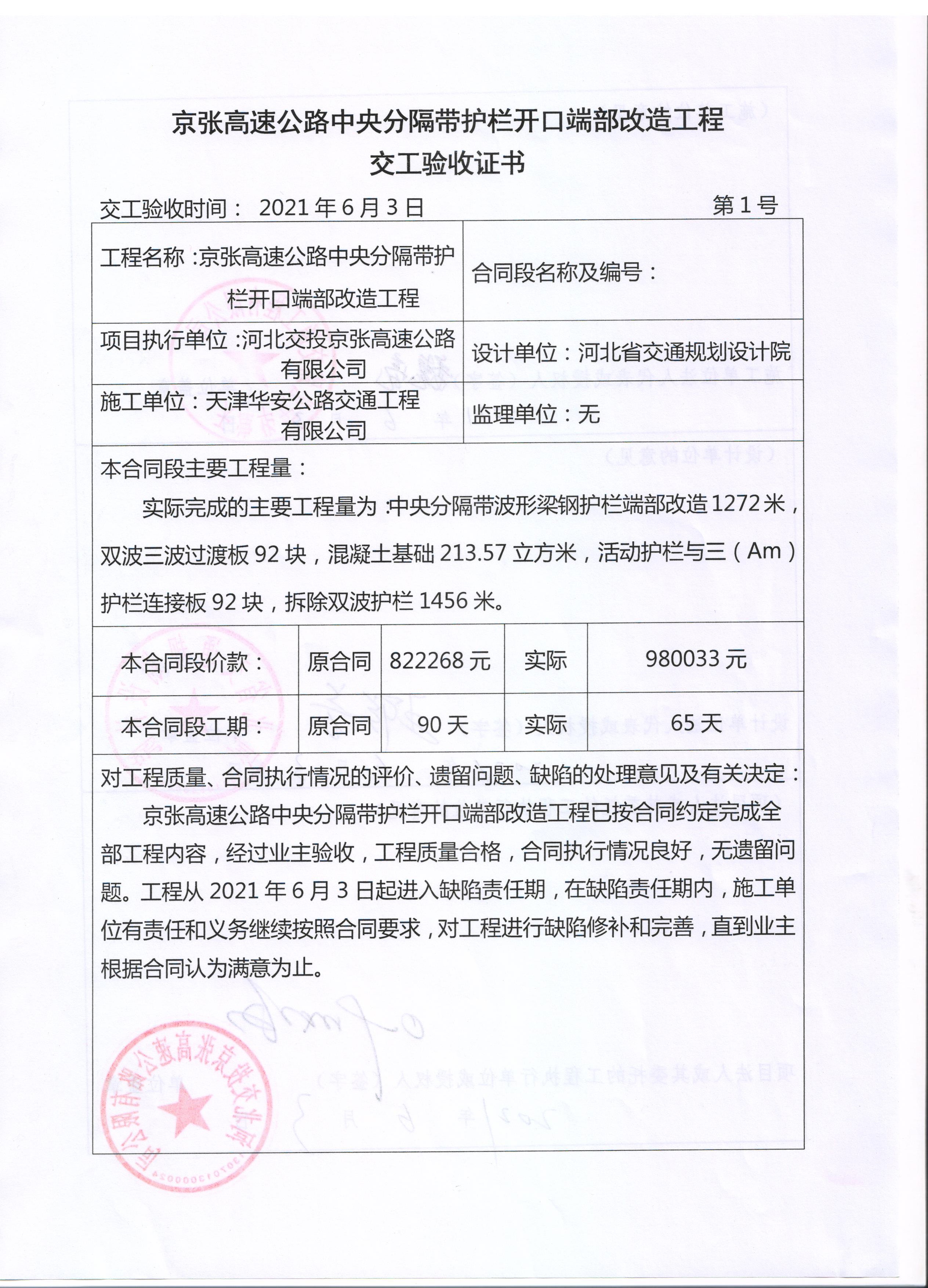 京張高速公路中央分隔帶護欄開口端部改造工程交工驗收證書